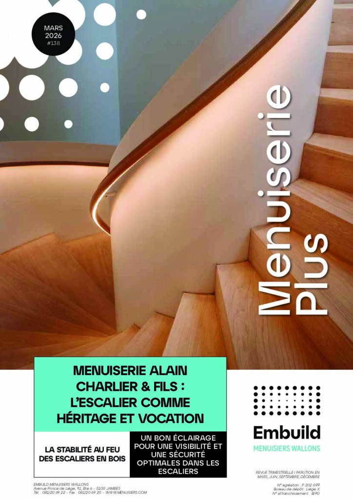 Menuiserie Plus est la revue professionnelle pour le secteur de la menuiserie, éditée par Embuild Menuisiers Wallons. Menuiserie Plus aborde les aspects techniques et esthétiques de la menuiserie, traite les développements les plus récents et les réalisations les plus impressionnantes dans ce secteur. La rédaction est assistée par des experts du secteur (CSTC, FFC, …) et des sociétés « leader » qui sont à la base même des développements dans ce secteur. Cette revue est distribuée gratuitement aux entreprises et acteurs du secteur impliqués dans la prise de décisions, la conception et l’élaboration de travaux dans le secteur de la menuiserie.